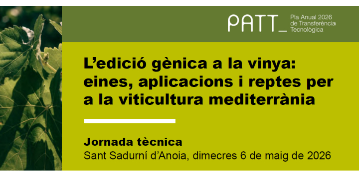 Afegir al calendari 2026-05-0609:30 2026-05-0614:30 Europe/Madrid L’edició gènica a la vinya: eines, aplicacions i reptes per a la viticultura mediterrània Celler de la Fassina de can Guineu Ccarrer Sant Pere 40-42 Sant Sadurní d’Anoia